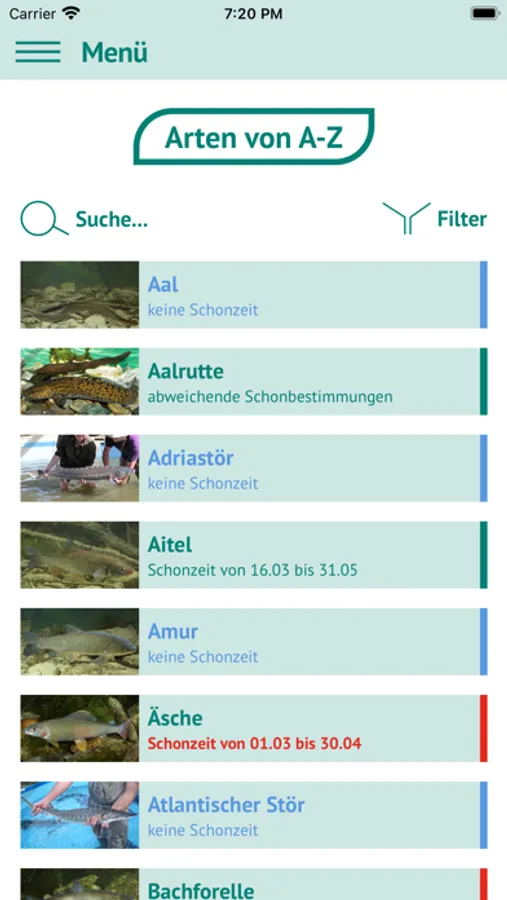 * Filteroptionen (z.B.: Ganzjährig geschonte Fische, spezifische Datumseingabe, usw.)