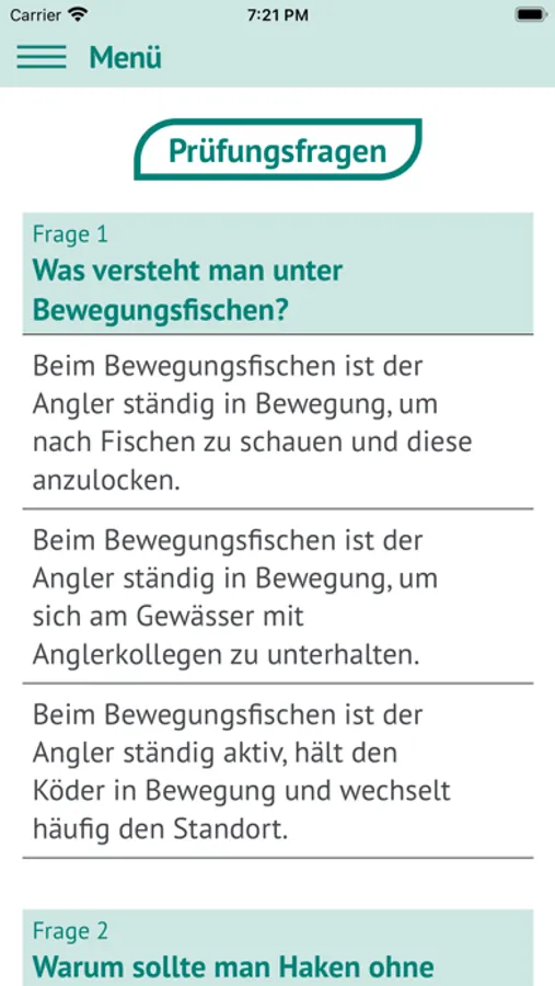 * Übungsfragen: Sie haben die Möglichkeit, die Fischerprüfung des LFVOÖ in der App zu simulieren. So können Sie für die Prüfung üben und Ihr Wissen testen.