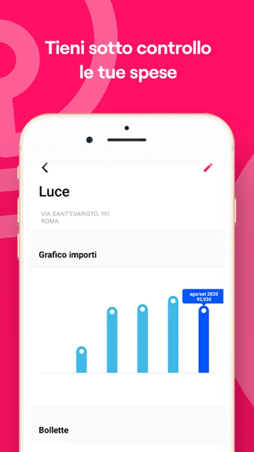 Scopri come abbiamo riorganizzato le informazioni delle tue bollette: verifica l’andamento della tua spesa attraverso grafici semplici e intuitivi. Potrai anche verificare l’emissione, gli importi, la scadenza e la modalità di pagamento delle tue bollette.