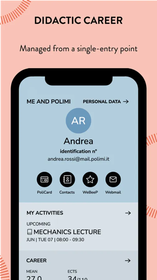 - manage your didactic career from a single-entry point, keeping track of study plans, lessons, exams and fees thanks to a proactive and personal agenda