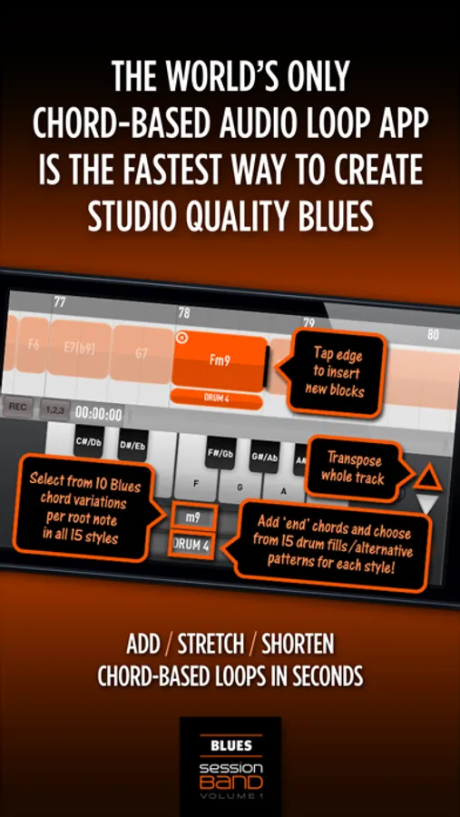 Create professional Blues tracks to your own chords in minutes with the award-winning SessionBand app - the world’s only chord-based loop app.