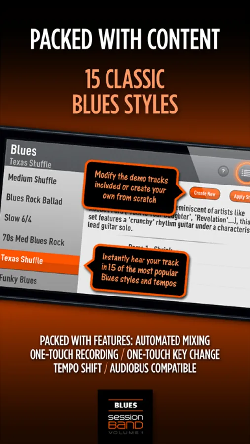 For Blues musicians and songwriters, this unique app is the ultimate tool for jamming and writing, with full and complete Blues tracks just minutes away! It's also simple enough for non-musicians to create their own great-sounding, royalty-free music with.
