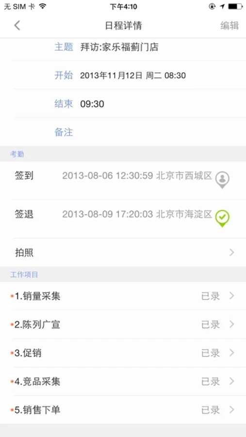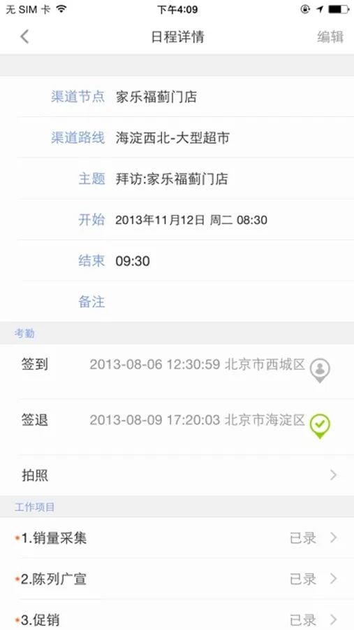 1.日程:可以查看、新增、调整拜访日程,录入拜访考勤(上传位置及照片)、工作项目,工作项目支持自由表单。