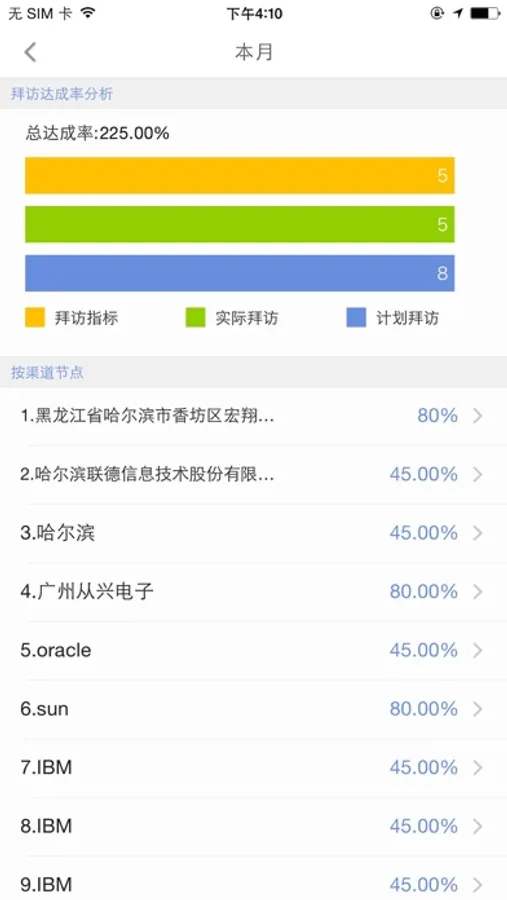 b.达成率分析:我的月度拜访达成率分析,可按渠道节点分组汇总。
