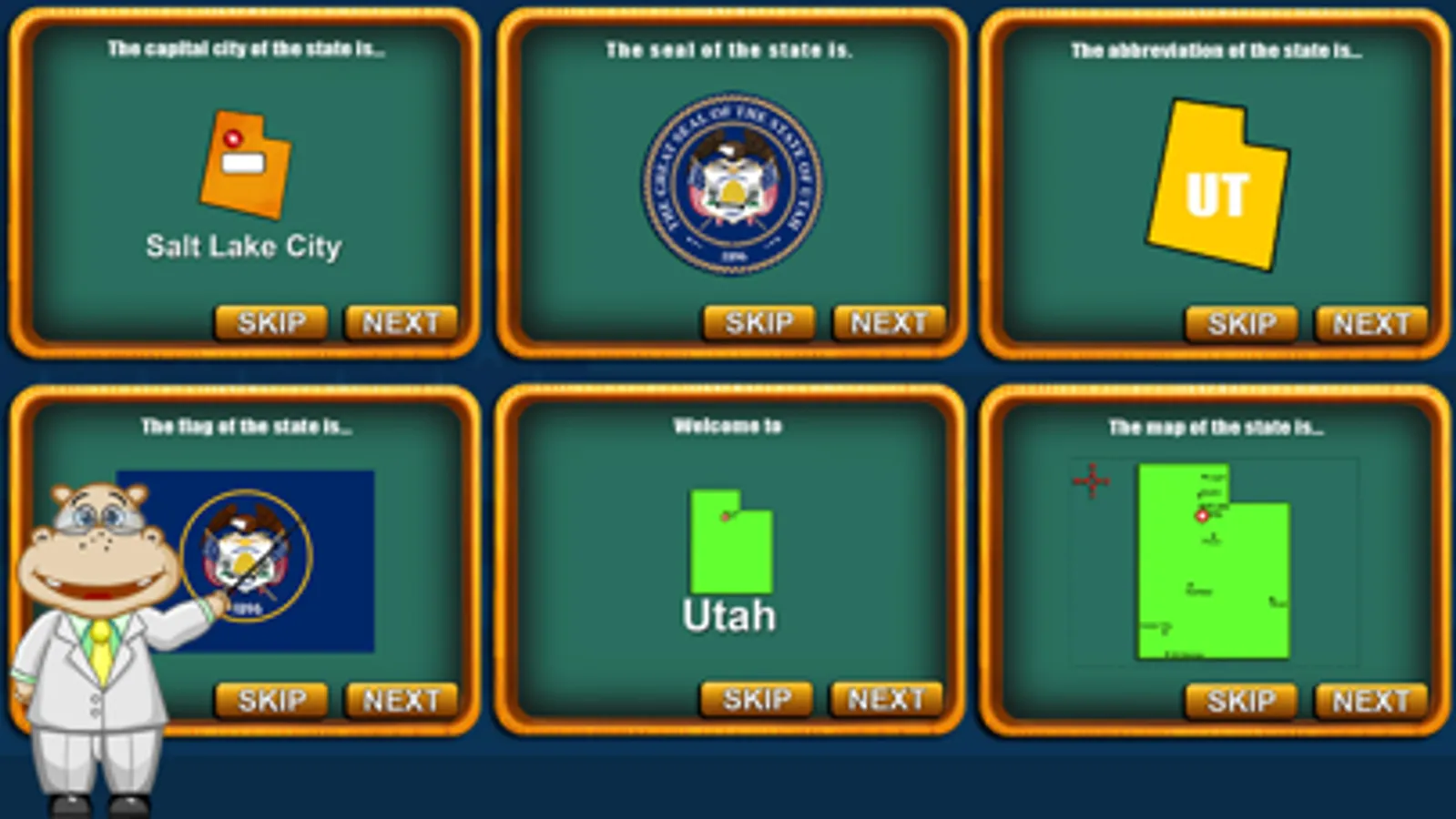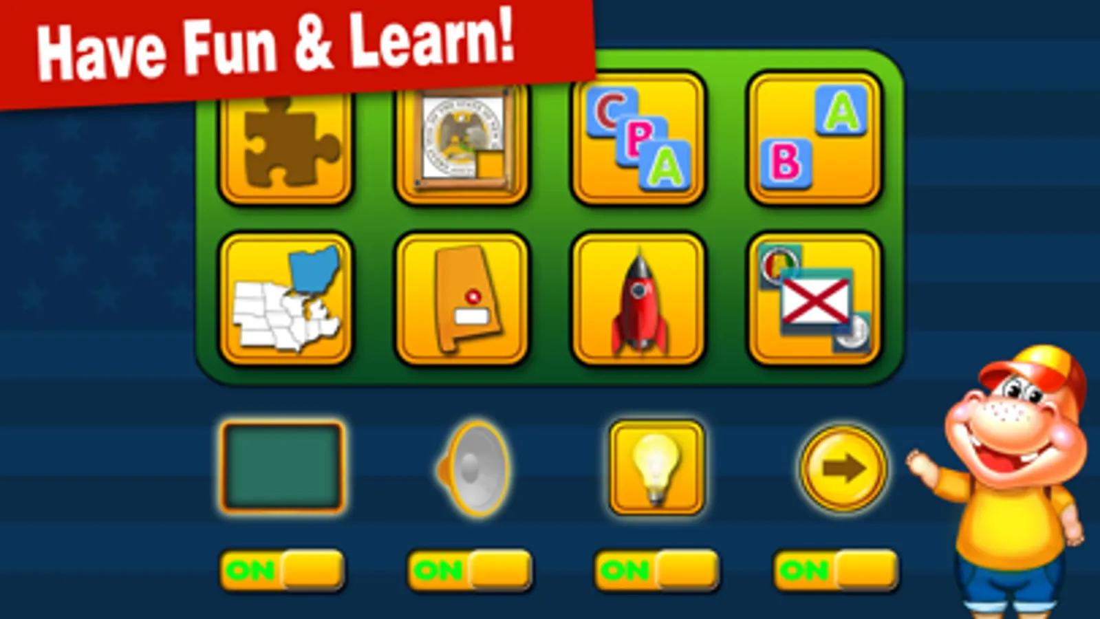 The cute Hippo is coming back! He will travel all 50 nifty United States, teach the knowledge of all 50 states, and play 10 fancy games with you! Start the amazing exploration by sliding two fingers to zoom in and out and click the shining star.