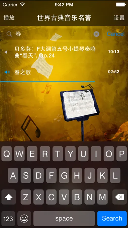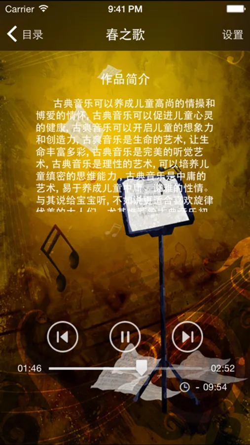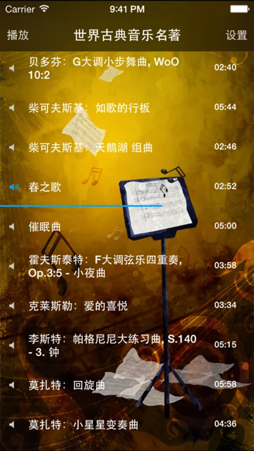 秉持对音乐的执着与理念,《世界古典音乐名曲》产品汇集了古典各个时期最有代表性和最具有代表性的大师的作品。高山流水,潇潇山雾,淌不尽沉淀的纠缠与缭乱,声声弦音似水流心跳;巴赫的管风琴,亨德尔的赞美诗,自天而降,不绝于耳;贝多芬的英雄呼唤,李斯特的浮士德意志,卷土而来,电闪雷鸣;勋伯格的难以追踪的变奏,韦伯恩的短小的生命动机,不平而鸣,欹重欹轻;肖邦的忧郁夜曲,德彪西的闪动意象,沁脾而入,光色不定……清新绚丽的界面风格,多变优美的音色,悦耳动心的器乐,古典浪漫演绎,名曲柔情倾诉。