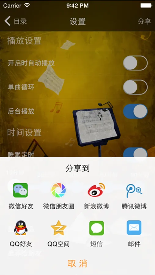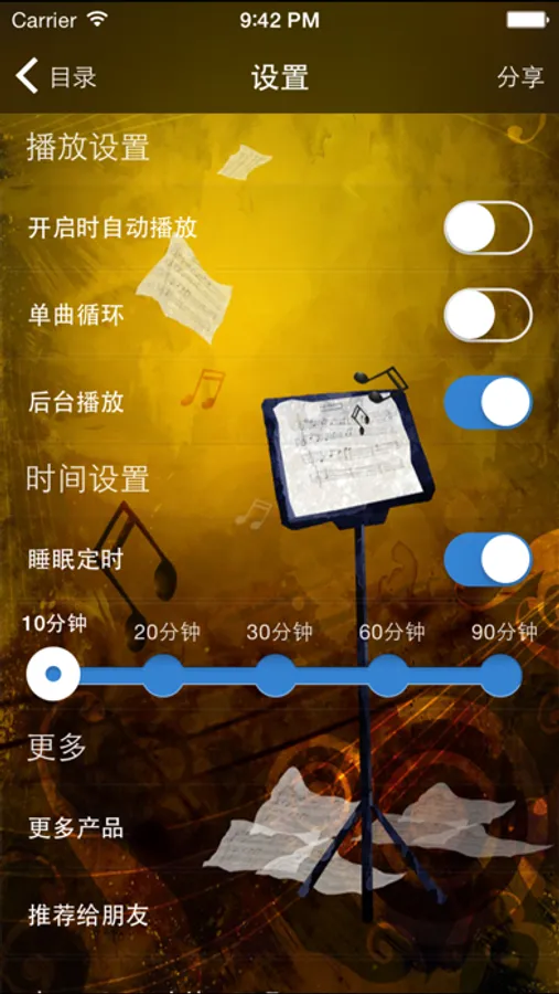 7.睡眠定时功能,可设定播放时间,到设定的时间后应用将自动暂停以免耽误您的休息。