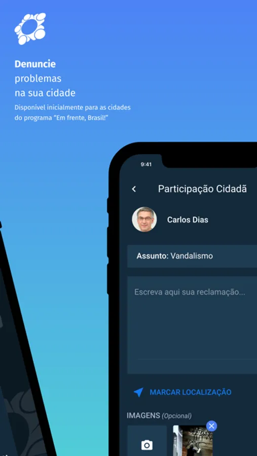 Participação Cidadã: trata-se de um canal de denúncia onde os usuários poderão relatar situações envolvendo desde segurança pública, a problemas de saúde, educação, meio ambiente, trânsito, dentre outros. A princípio, a funcionalidade está disponível apenas para os cidadãos que residem em uma das cinco cidades que fazem parte do “Em frente, Brasil” (Ananindeua/PA, Paulista/PE, Cariacica/ES, São José dos Pinhais/PR e Goiânia/GO), projeto-piloto do Governo Federal que versa sobre o enfrentamento à criminalidade e violência. Vale destacar que as informações registradas no aplicativo serão encaminhadas para a Plataforma Integrada de Ouvidoria e Acesso à Informação do Governo Federal.