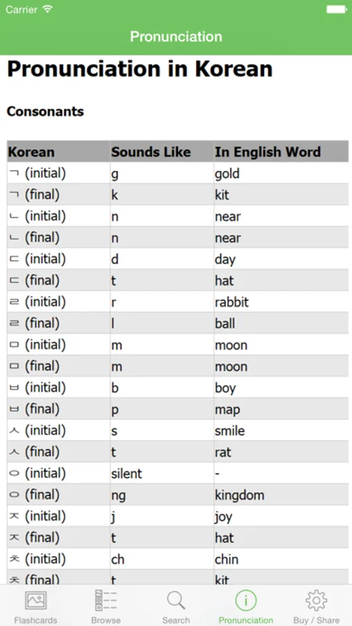 Refresh how to pronounce the Korean alphabet with the pronunciation table.
