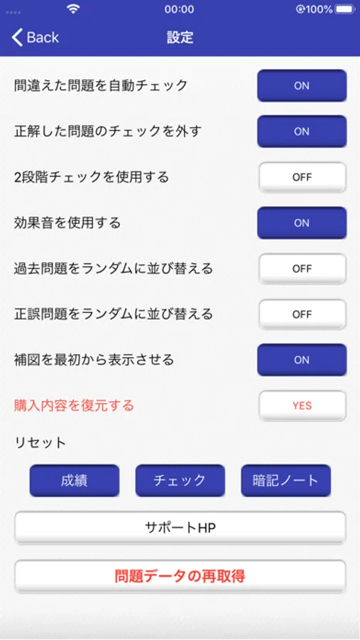 (自動チェック、ランダム、補図のON・OFF、成績リセット等)