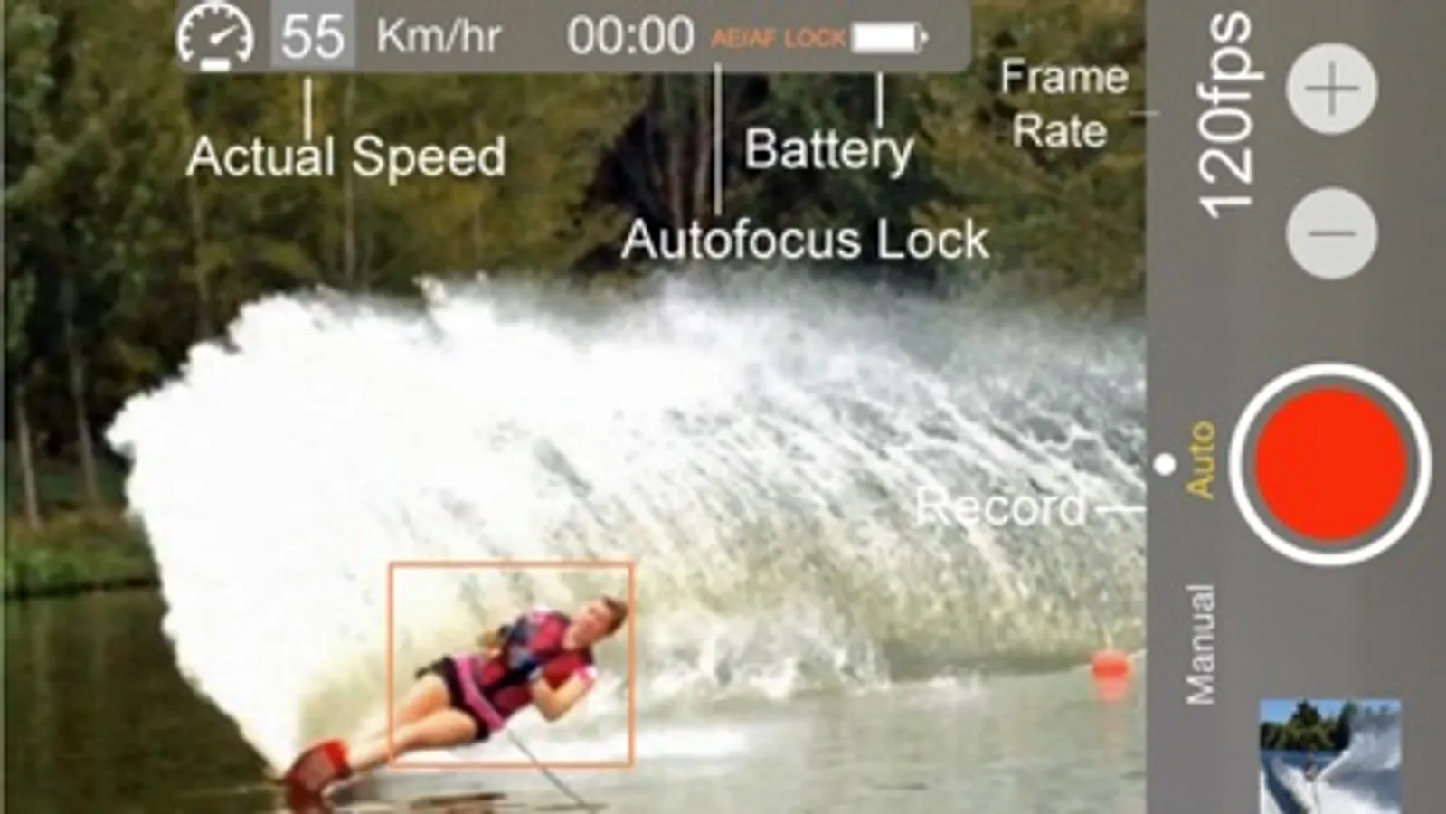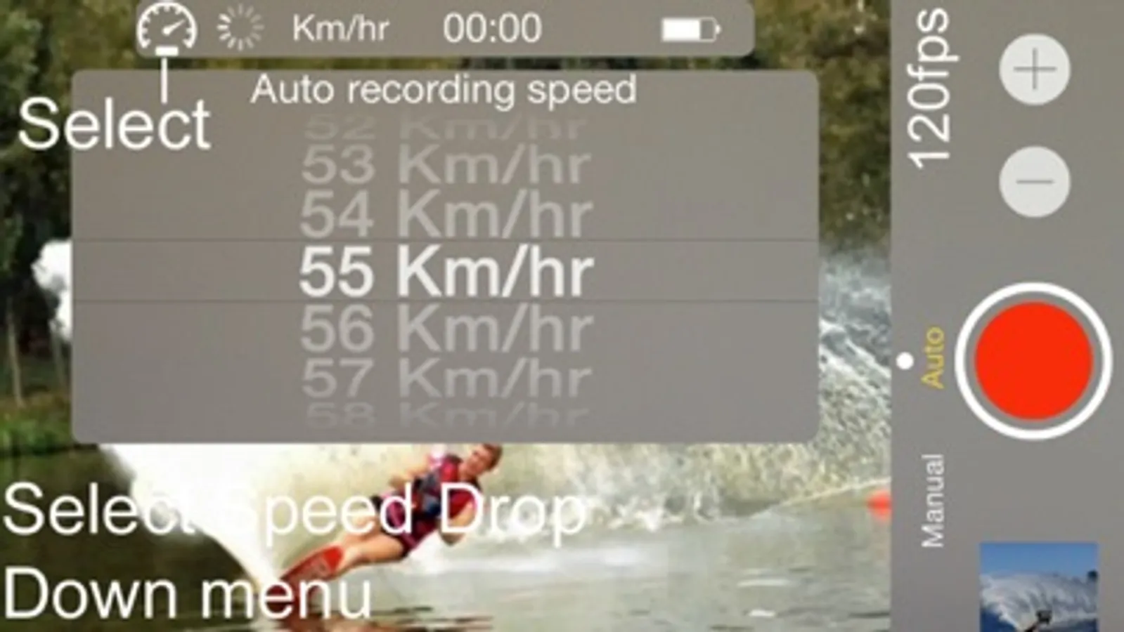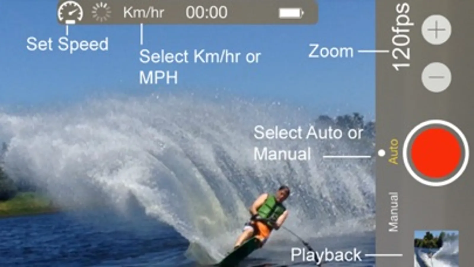 Simply set your speed and your iPhone or iPad Mini ( only with GPS) will start video recording when your boat reaches the set speed.