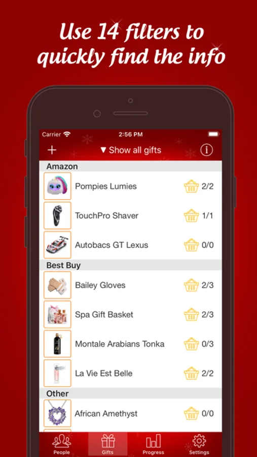 • Track gifts by status: Idea, Need to Make, Need to Buy, Made, Bought, Shipping, Received, Wrapped, Sent, Presented