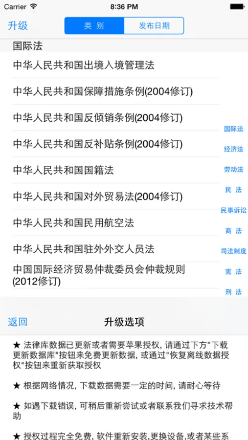 适合法律专业者随身查找使用,比如律师,法律学者,法律专业学生,公务员考试等. 法律大类一览: 国际法、行政及行政诉讼、经济法、民法、民事诉讼及仲裁、商法、司法制度及法职、宪法、刑法、刑事诉讼等.