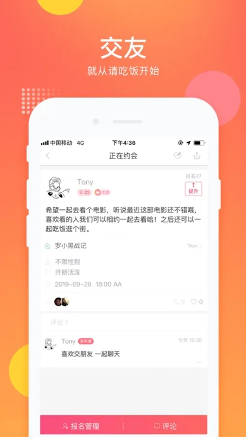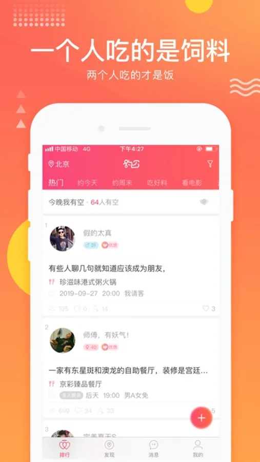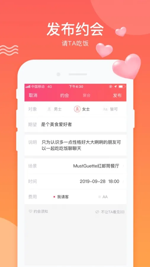 请吃饭,是一个快速线下交友平台。使用请吃饭,可以花费信用发布约会,也可以报名别人发起的约会,请吃饭将线上交友转移到线下,安全快速交友。