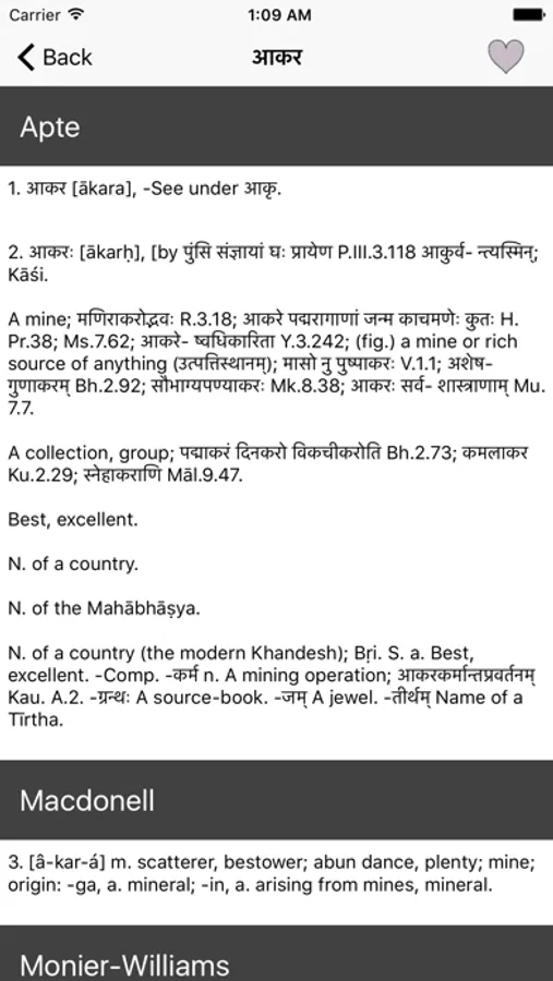 Its massive database provides over one million definitions derived from classical Sanskrit dictionaries by Monier-Williams, Apte, and Macdonell. In addition, references from dhatu-patha (a collection of verbal roots with final forms) are also provided, when available.