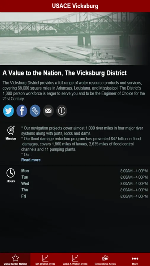 The Vicksburg District provides a full range of water resource products and services, covering 68,000 square miles in Arkansas, Louisiana, and Mississippi. The District's 1,000-person workforce is eager to serve you and to be the Engineer of Choice for the 21st Century.