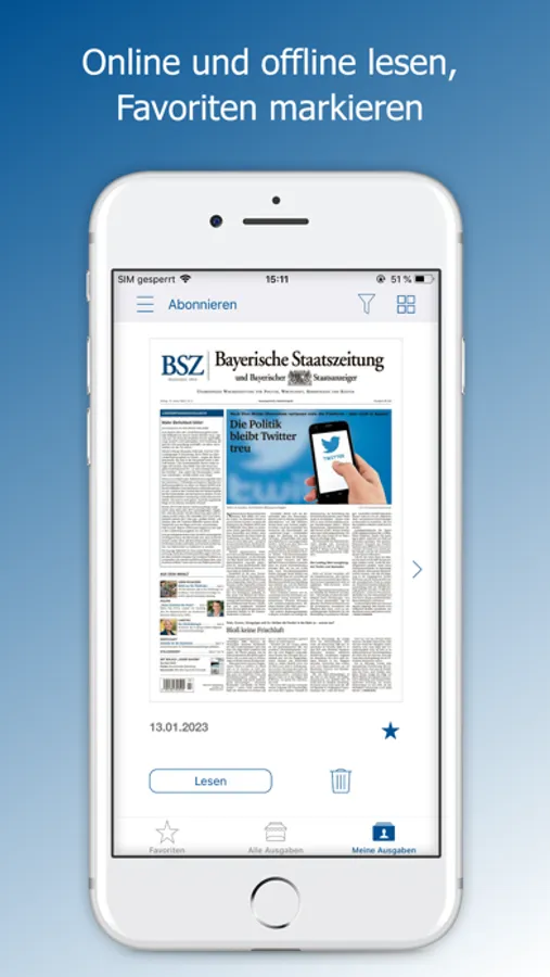 Mit der kostenfreien iOS App können Sie die Ausgaben der Bayerischen Staatszeitung zum Preis von € 2,49 je Ausgabe kaufen. Alternativ steht Ihnen ein Abonnement mit folgender Laufzeit zur Verfügung: