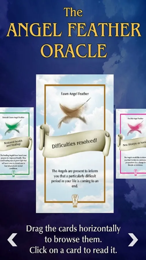 This deck comprises a beautiful combination of 'Colour Energy' and 'Angelic Guidance'. The app assists you with performing and interpreting your Angel Feather readings.