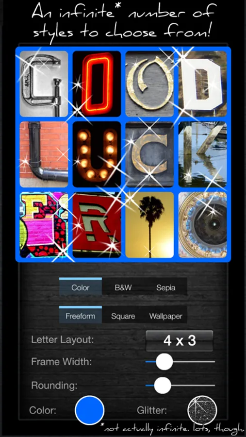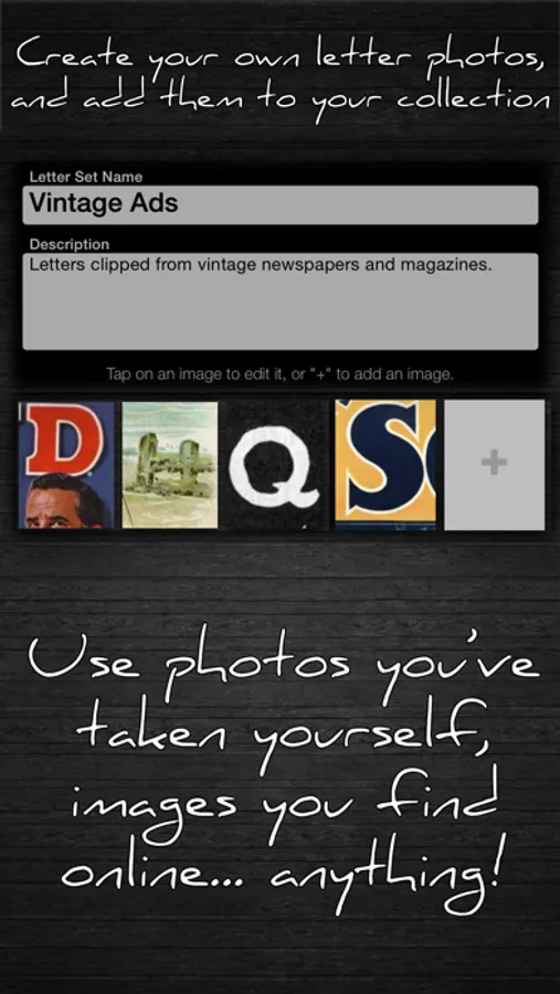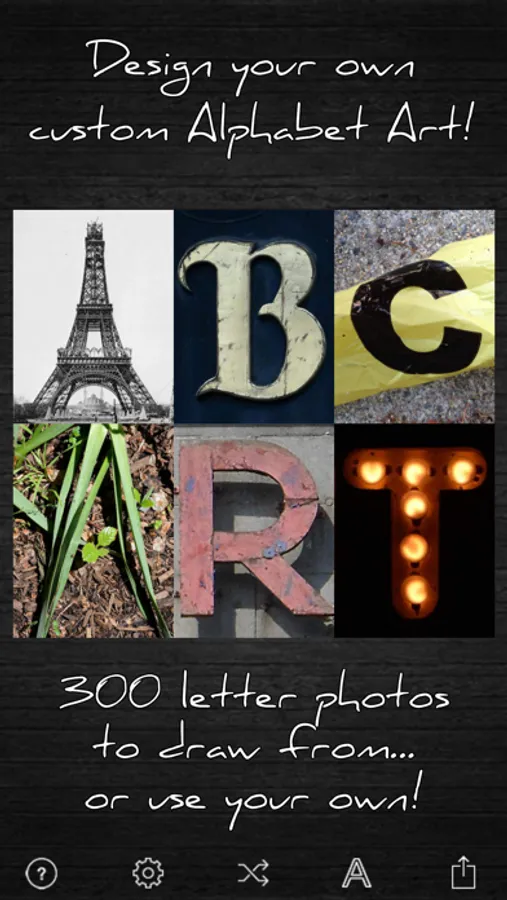 Alphabet Art includes a set of 301 high-quality letter photos, most of which are 100% original and can't be found anywhere else. You can also create your own letter photos, using any photo you want to represent any letter (or punctuation, or even emoji!) you want. And there are more Letter Sets available for purchase -- if you see a number badge on the Letter Sets button on the main screen, you know there's a new one in the store!