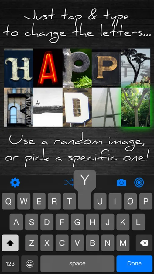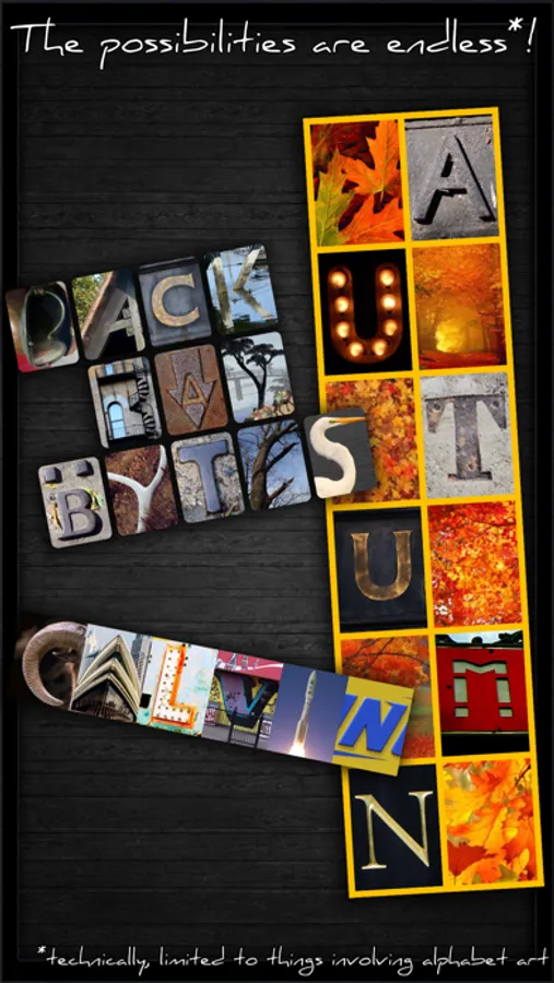 Alphabet Art for iOS lets you create your own personalized piece of dynamic Alphabet Art -- words and phrases spelled out of photographs, each of which either looks like, or contains, a letter. There are lots of options and fun ways to express your creative side in Alphabet Art -- just try things out and see how they work!
