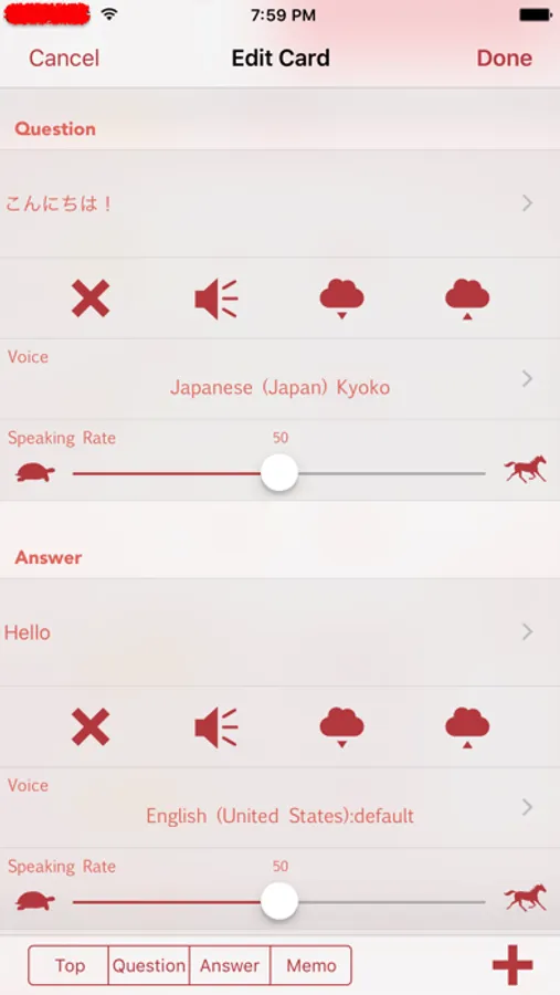 Add voice or text for reading(Text to Speech) as card “Questions" and “Answers”.