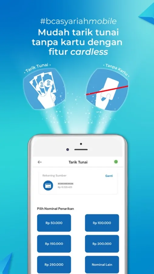 2. Cardless transaction for cash withdrawal through Cardless menu. For more information visit this link https://www.bcasyariah.co.id/cardlessbcasyariah