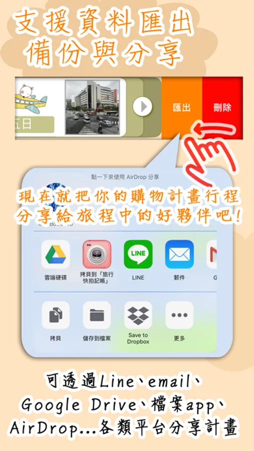 - 透過Line、email、Google Drive、Dropbox、AirDrop...等各類平台分享給朋友都方便喔!