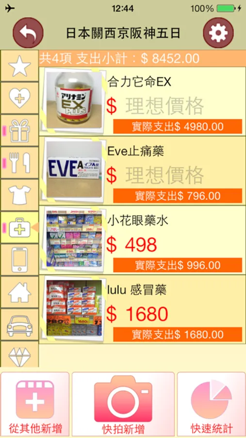 ——新增並管理消費明細:將需要購買的商品圖片快拍存入(也可從相冊存入),也可備註名稱和理想價格。
