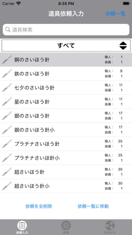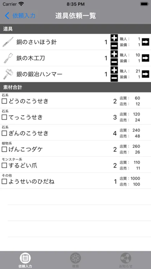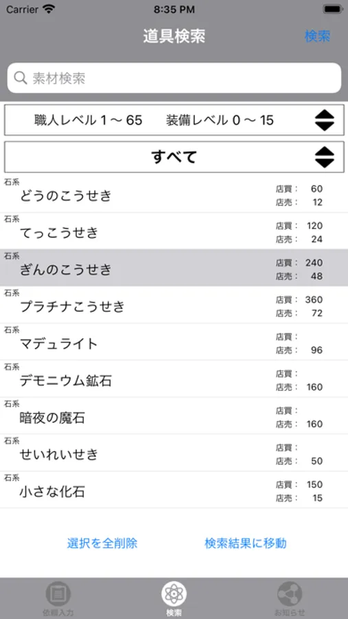 ・素材から道具鍛冶職人が作成できる装備品を検索