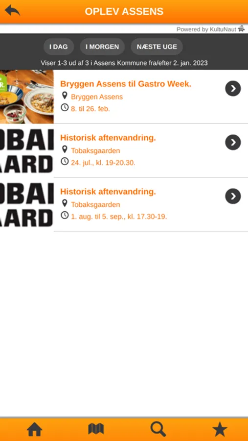 Med applikationen kan du via eventkalenderen få et hurtigt overblik over dagens, morgendagens eller ugens arrangementer. Ved hjælp af søgefunktionen kan du finde arrangementer inden for netop dit interessefelt. Med applikationen kan du planlægge en god oplevelse for dig selv, for vennerne eller for familien.