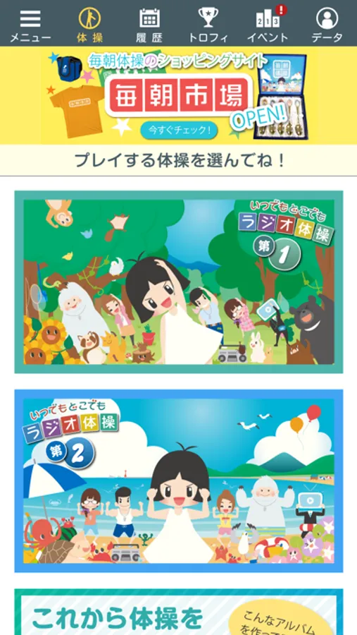 持っている(購入した)音楽ファイルを設定して体操するときは「家定先生」を選んでね。あの懐かしいラジオ体操の音楽を設定しよう!