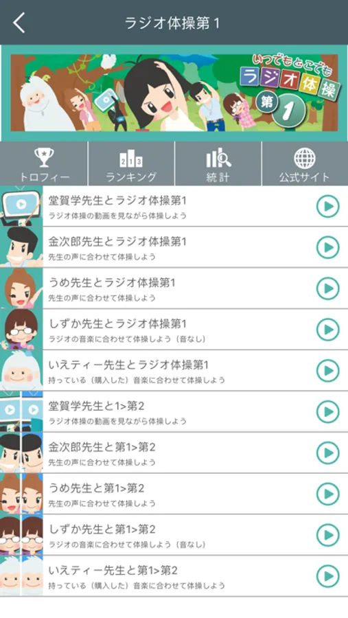 ラジオから流れてくる音楽に合わせて、みんなでラジオ体操するときは、「しずか先生」を選んでね。この先生を選んだときは音楽が流れないよ。