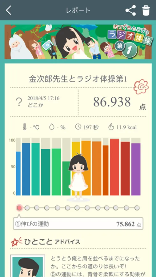 レポートにはスコアや消費カロリーなど様々な情報がカラフルなグラフやコミカルなアニメーションと共に記録されるよ。