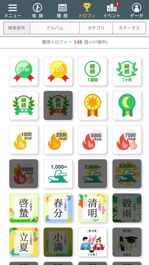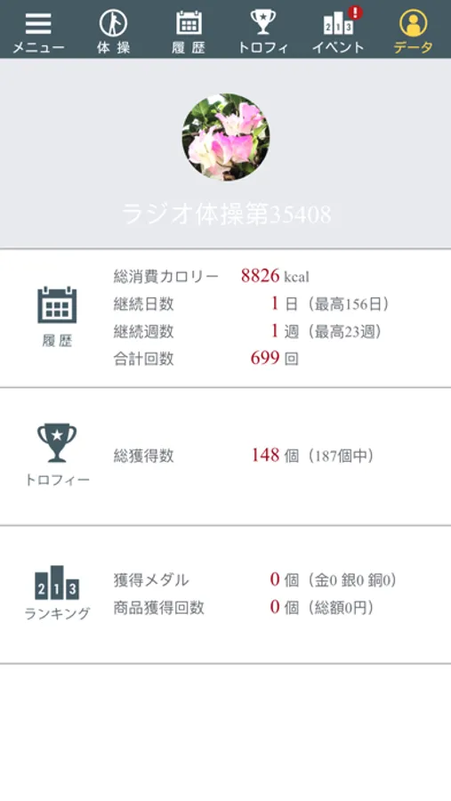 総実施数や総消費カロリーなど、これまでどれだけ頑張ったかが数値で確認できるよ。数値をコツコツ積み上げよう!