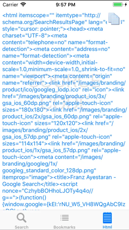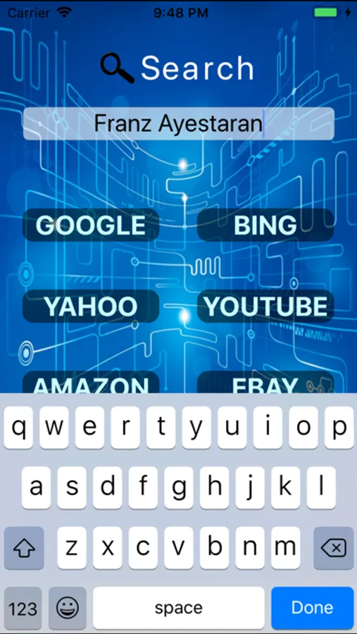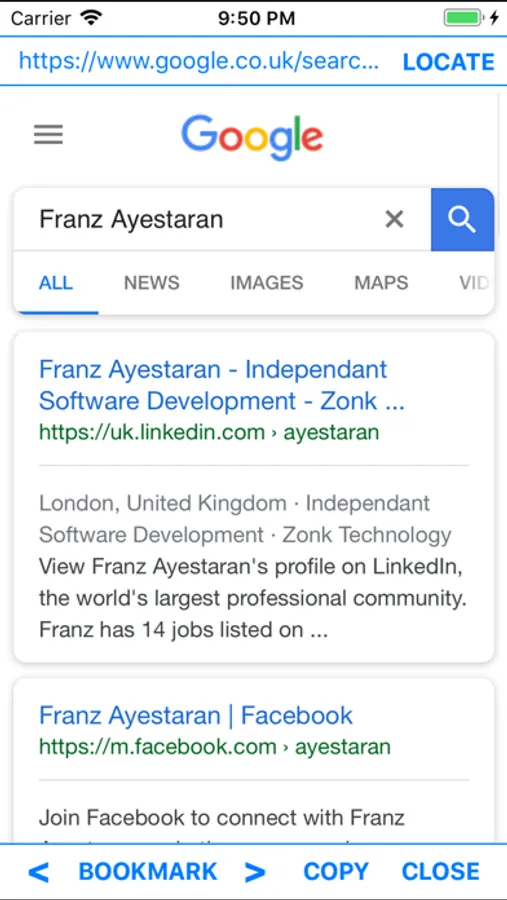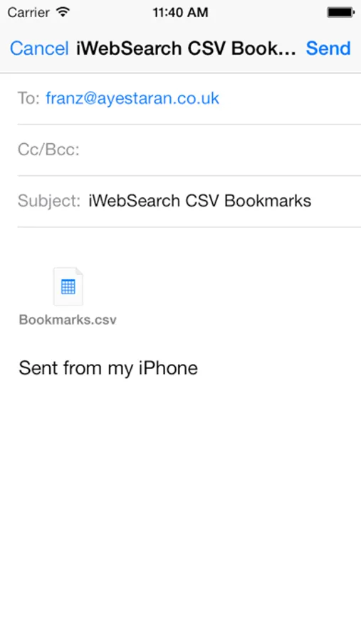 iWebSearch is designed to speed up the process required when submitting a single search term to multiple search engines. By simply tapping on the desired search engine the user can scroll through the list then repeat the process by navigating back and tapping an alternative search engine. Bookmarked results can be viewed then exported via email in a Comma-separated format.