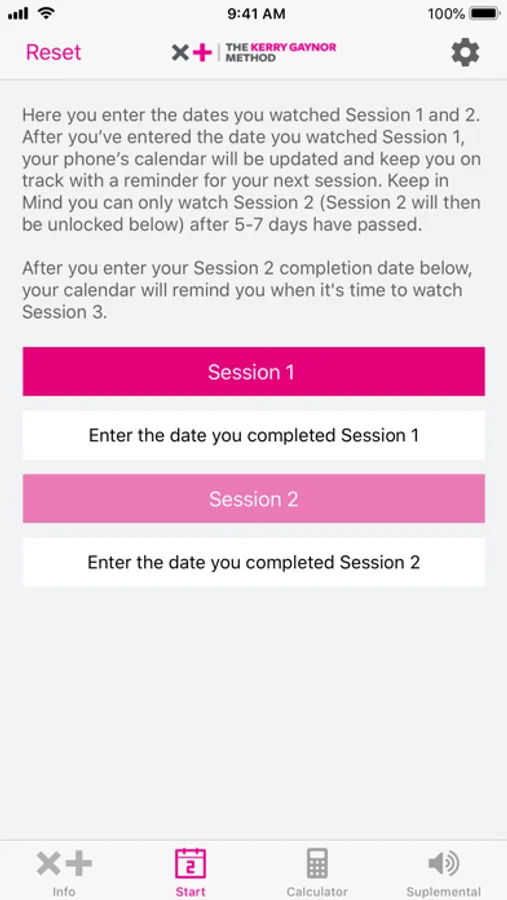 Once you receive The Kerry Gaynor Method DVDs watch Session 1. Afterwards, hit the “Start” tab to enter in your Session 1 completion date. The Method app will help you stay on track throughout the course of your journey with helpful reminders and updates to your calendar.