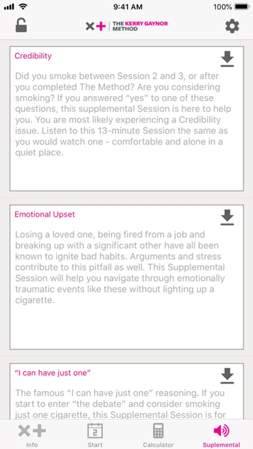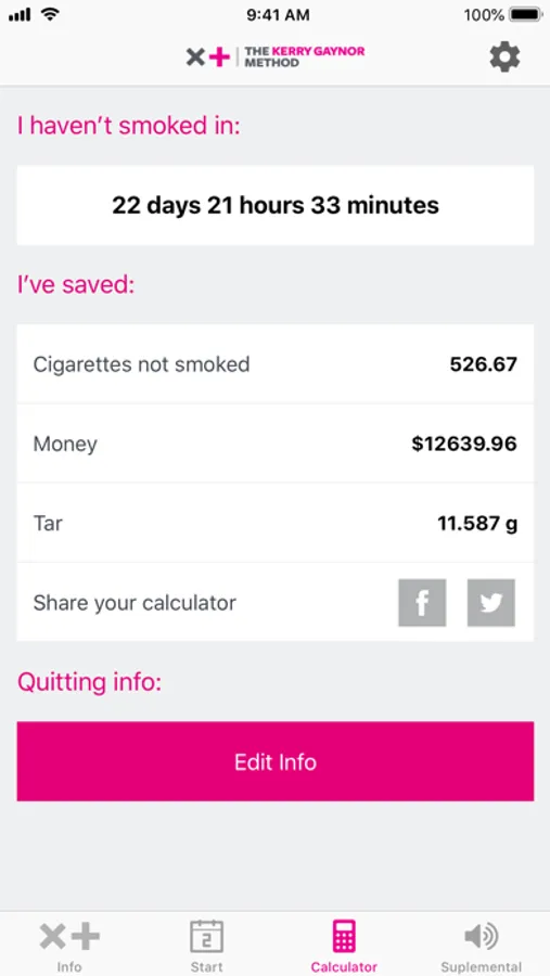 Throughout your participation in The Method, this app will track your progress during your journey of becoming a nonsmoker for life. By sending you reminders and mantras, keeping track of how much money you're saving by not smoking cigarettes, and more, this app is here to help you during and after you've completed The Kerry Gaynor Method.