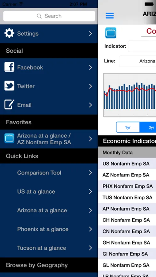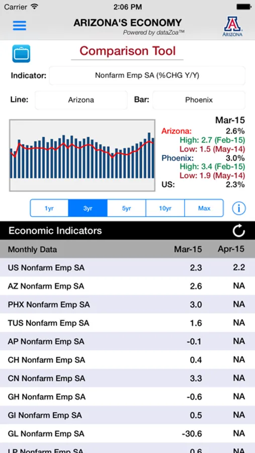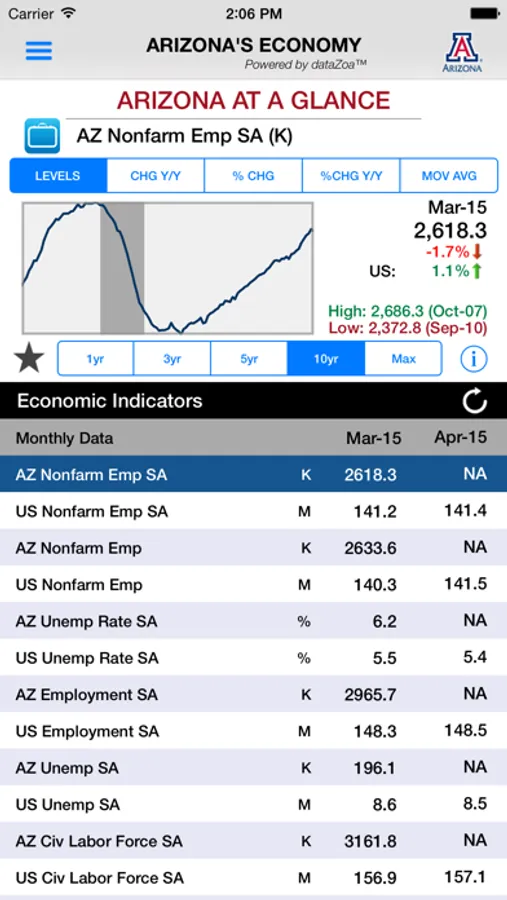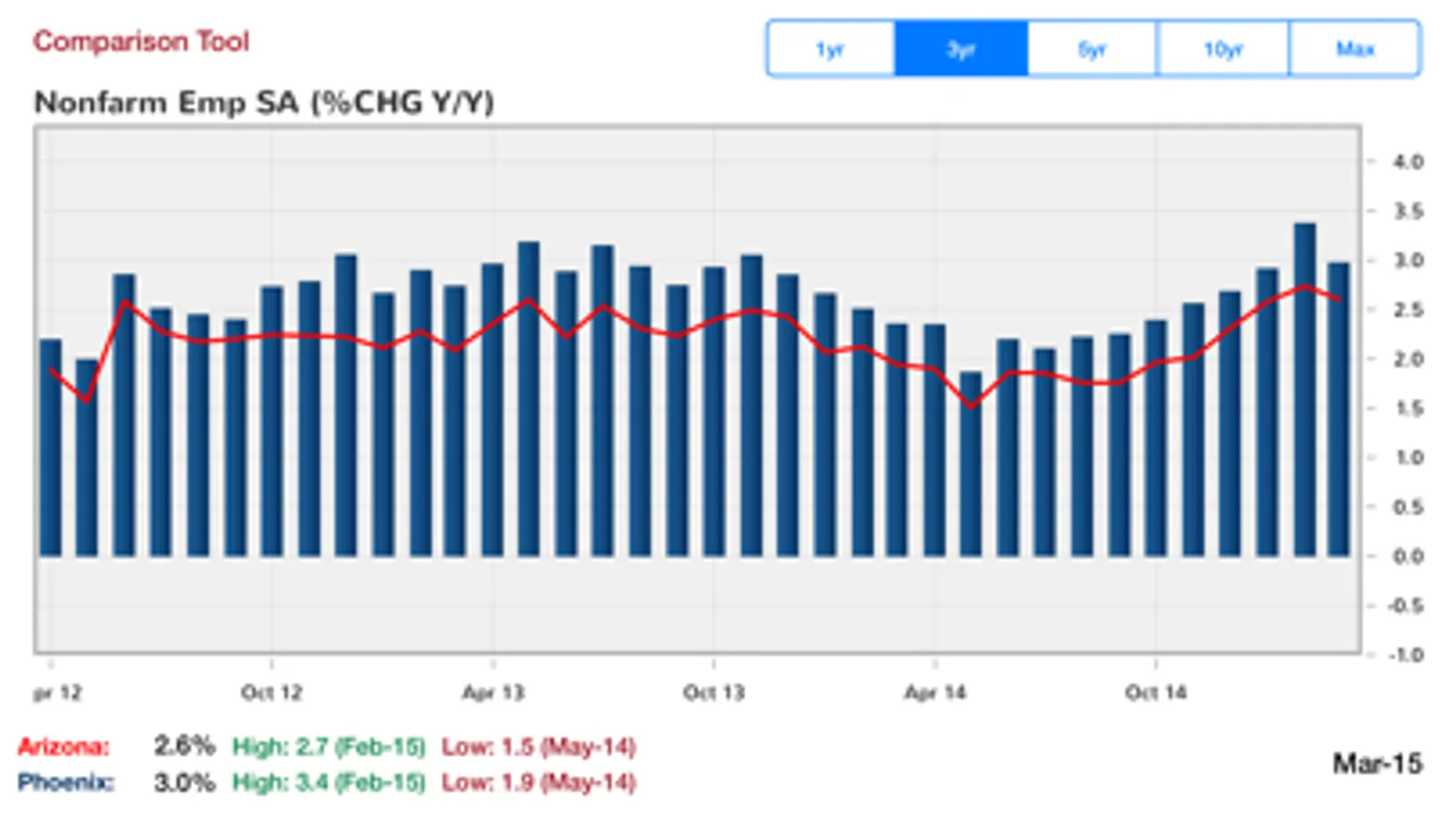 Put the latest economic data for Arizona at your fingertips! Access important metrics such as employment growth, retail sales, population, and personal income for Arizona, its counties, and metro areas. Analyze trends, compute percent changes and moving averages across multiple time horizons. Use the Comparison Tool to track how your city or county performs relative to Arizona and the U.S. Quickly share charts and data with colleagues via email or social media. Keep up-to-date with our statewide and local economies from your smartphone or tablet with the Arizona’s Economy smartphone app!