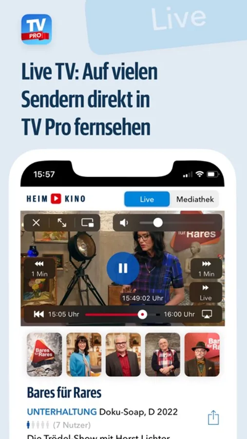 TV Pro is the only TV guide to include live streaming as well as on-demand access to public broadcast Mediathek content all in one app.