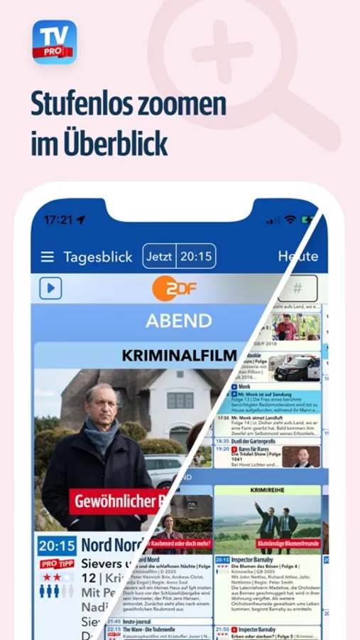 The unique "Tagesblick" layout presents upcoming TV shows in the familiar layout you know from traditional TV guide magazines.