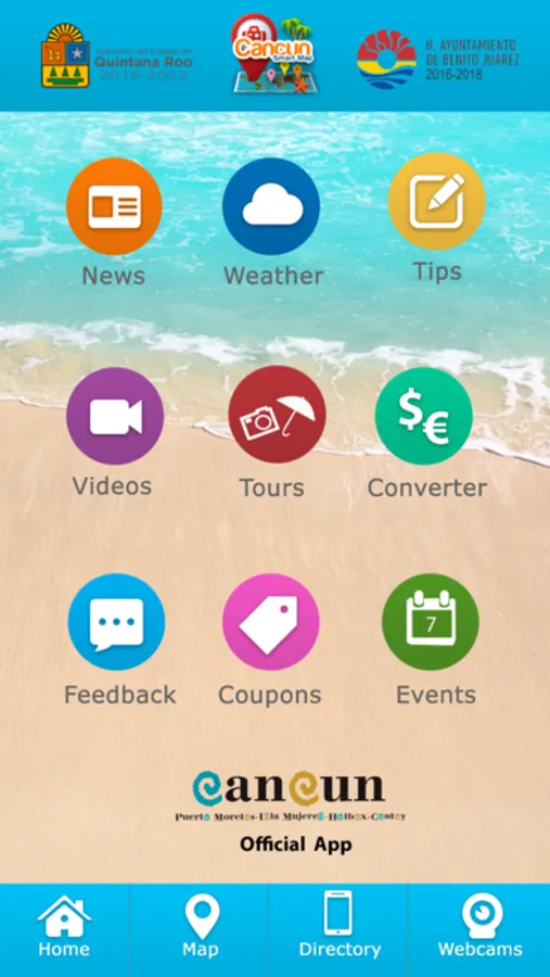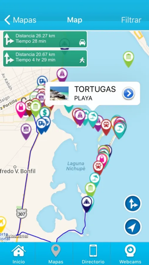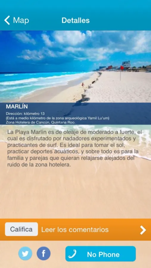 - An interactive map showing you with distance and time information to a wide range of spots in Cancun, including beaches, ATMs, hospitals, shopping malls, local markets, bus stops, taxi sites and more. You can also tap into each place in the map and access a section with photos, description, reviews and contact information.