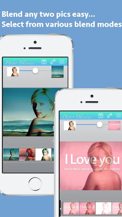 All the blend modes will be processed by default and you can choose the desired blending effect by just scrolling thorough the images at the bottom.