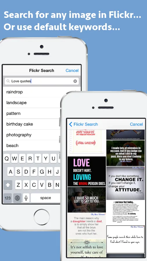 Tap on the input images and select 'Search for Web Photos' to get a public photo from Flickr. Use any desired search string to directly search photos in Flickr and add to blend with.