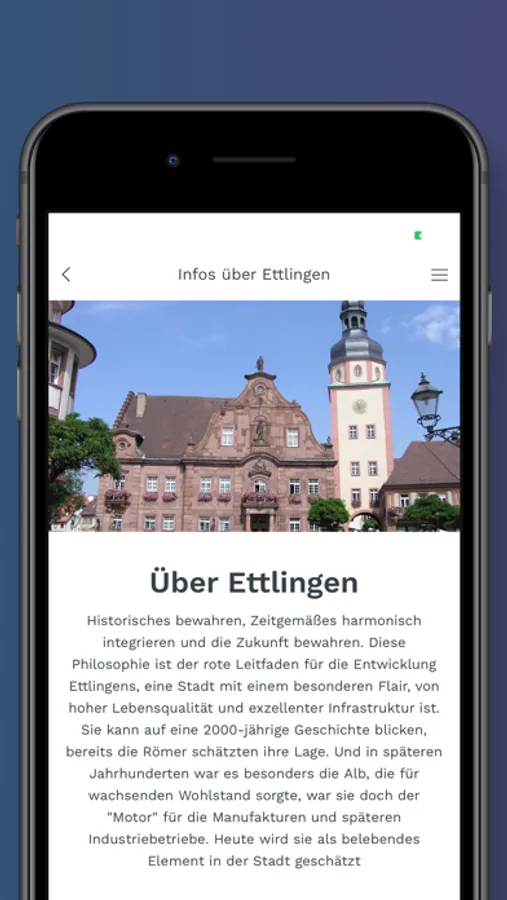 Ettlingen für die Hosentasche. Der User hat alles Wissenswerte über die Stadt immer dabei. Von den aktuellen News, über laufende Veranstaltungen, Push-Nachrichten bis hin zu den wichtigsten Rufnummern der Notdienste.