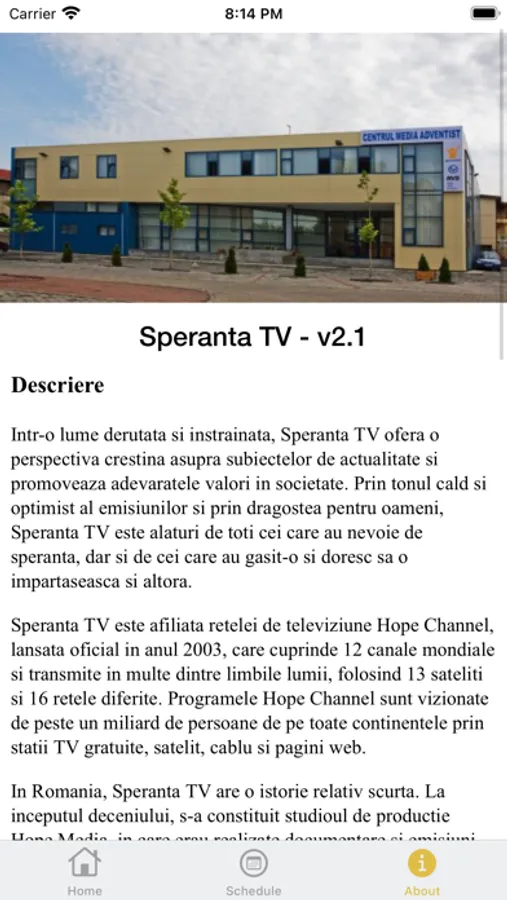 In anii 2004-2005 a fost construit si a inceput echiparea unui centru de productie si s-a s-a cristalizat ideea curajoasa a infiintarii unui canal propriu de televiziune. Prima zi de emisie a noului post, Speranta TV, a fost 30 aprilie 2007, la ora 18. Sloganul postului este „Pasiune pentru viata”, iar valorile pe care le promoveaza – speranta, libertatea, increderea in puterea credintei de a innobila existenta umana.