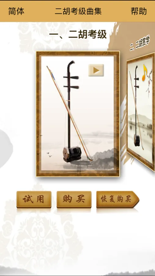 《二胡考级曲集》是一款专门为二胡考级学生研发制作的实用参考学习软件,内容包括两各部分《全国二胡考级》和《二胡名曲欣赏》,《全国二胡考级》严格按照全国二胡考级委员会考试规定的曲目及定级标准,进行了全面细致的归纳整理,内容包含二胡考级要求、二胡的保养,1-10级考级中外曲目原版辅导示范视频和乐谱等。《二胡名曲欣赏》包含40首二胡名曲音频资料和名曲简介。