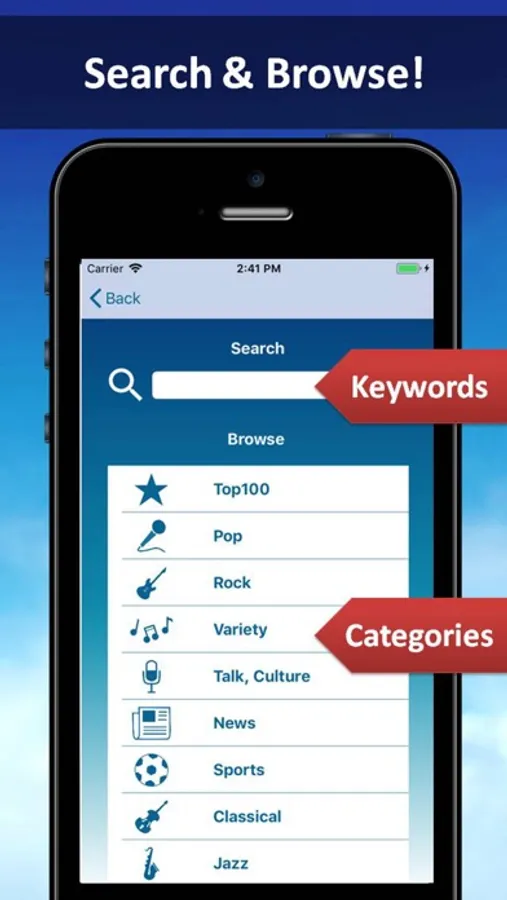 Looking for a particular radio? You want to discover new radios or foreign radios? Nothing more simple with the powerful search engine! You can also browse categories according to your moods: pop, rock, rap, reggae, news, classical music ...