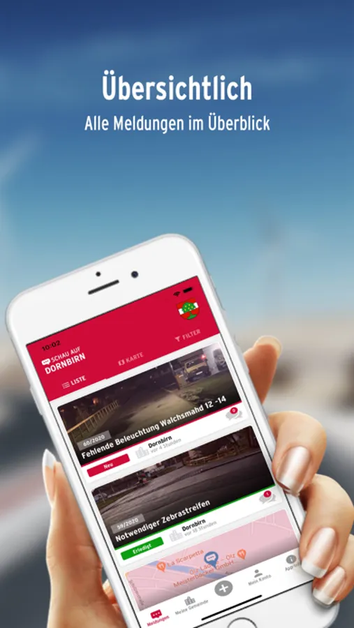 Mit der „Schau auf Dornbirn“-App können Sie ganz unkompliziert Ihre Zufriedenheit, Ihre Verbesserungsvorschläge und Ideen, aber auch Mängel im öffentlichen Raum der Stadt melden. Alles, was Ihnen in Dornbirn positiv oder negativ auffällt, wird hier unbürokratisch an die zuständigen und kompetenten Mitarbeiterinnen und Mitarbeiter der Stadt Dornbirn zur Bearbeitung übermittelt. Die Mitarbeiter werden sich bemühen, die Mängel so schnell wie möglich zu beheben. In der Übersicht sind sämtliche Mitteilungen für alle Nutzer offen und transparent dargestellt. Der Status der Meldungen wird laufend aktualisiert.