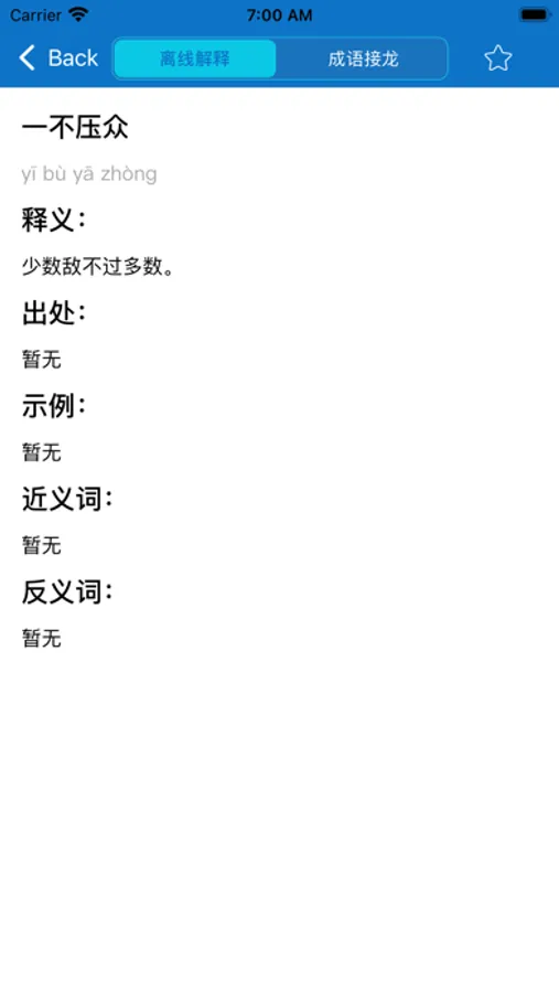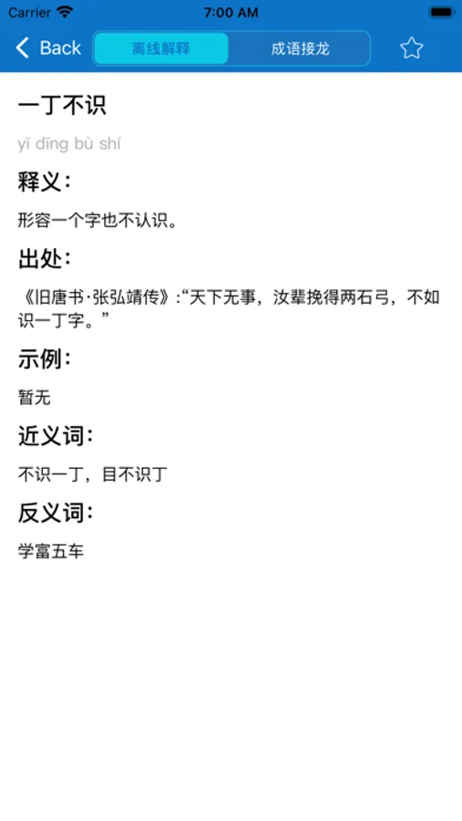 本词典完全免费,可离线查也可在线查,集三万多条词典及三千多条成语故事于一体。另外每条成语带有拼音、释义、出处和造句示例,是一本非常方便的成语查询应用,软件使用完全免费,不做任何收费限制,纯粹是为了方便各位师生学者平时学习使用,感谢大家的支持!
