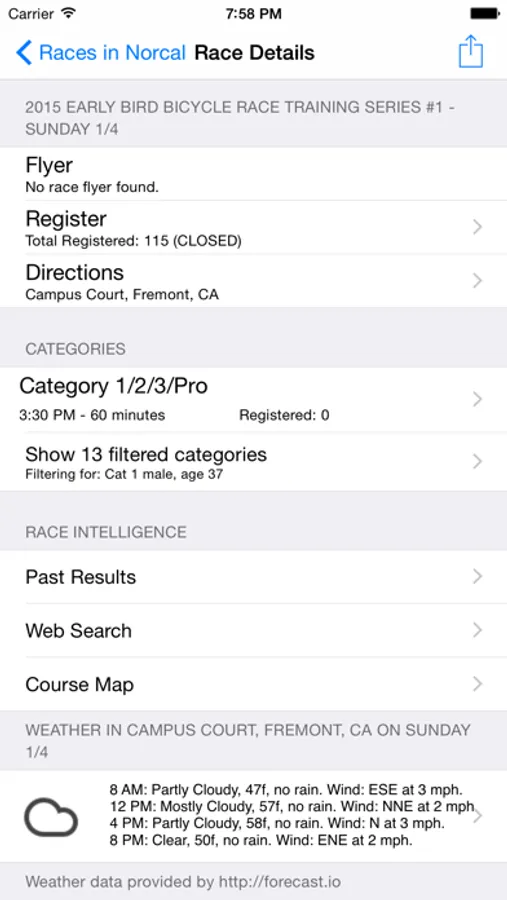 Race Ready helps you find local USA Cycling bike races, see how many racers are registered for your category, who’s pre-registered, what their results are, register for races, get directions to a race, check the weather, and more.